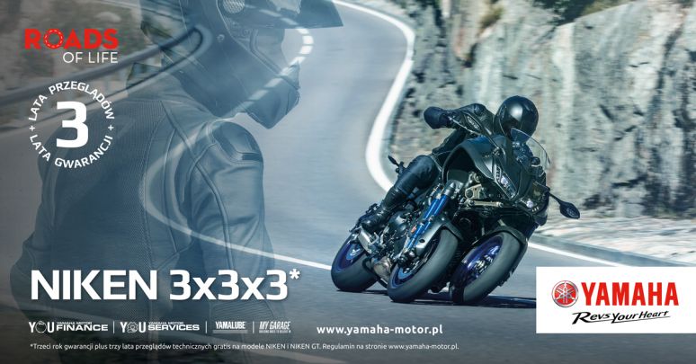 Wiosenna promocja jest pierwszą ogłoszoną na ten najbardziej rewolucyjny pojazd Yamahy z ostatnich lat. Do końca maja zakup trójkołowego NIKEN-a jest premiowany pakietem mnożących się korzyści. Do wyróżniających NIKEN-a i zapewniających niesamowite doznania z jazdy trzech kół dealerzy Yamahy dokładają dodatkowy, trzeci rok gwarancji oraz trzy lata bezpłatnych przeglądów okresowych realizowanych w autoryzowanych serwisach Yamahy. Szczegóły promocji dostępne w regulaminie.